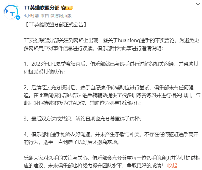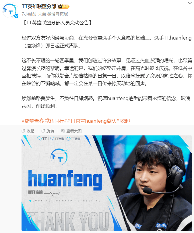 不过TT俱乐部最终却并没有选择他,反而是在离队的时候双方不欢而散。一方面焕峰的粉丝指责TT俱乐部给选手画饼让其新赛季转辅助来获得出场机会,却最终爽约。