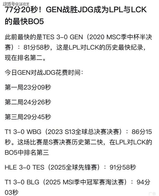 这场比赛结束之后,lpl赛区和lck赛区最快BO 5的纪录被刷新,在此之前,是S10赛季的msc季中杯半决赛,Tes战队三比零击败了gen战队,时间是81分58秒。这一次gen战队碾压jdg战队,只使用了77分20秒,没有任何一场比赛超过30分钟。这种对决才是最绝望的,根本找不到任何的翻盘点,完全是硬实力上的碾压。感觉今年的lpl赛区可能又要走远了,要知道这一次的比赛还看不到T1战队,他们都是在最后的世界总决赛才发力。
