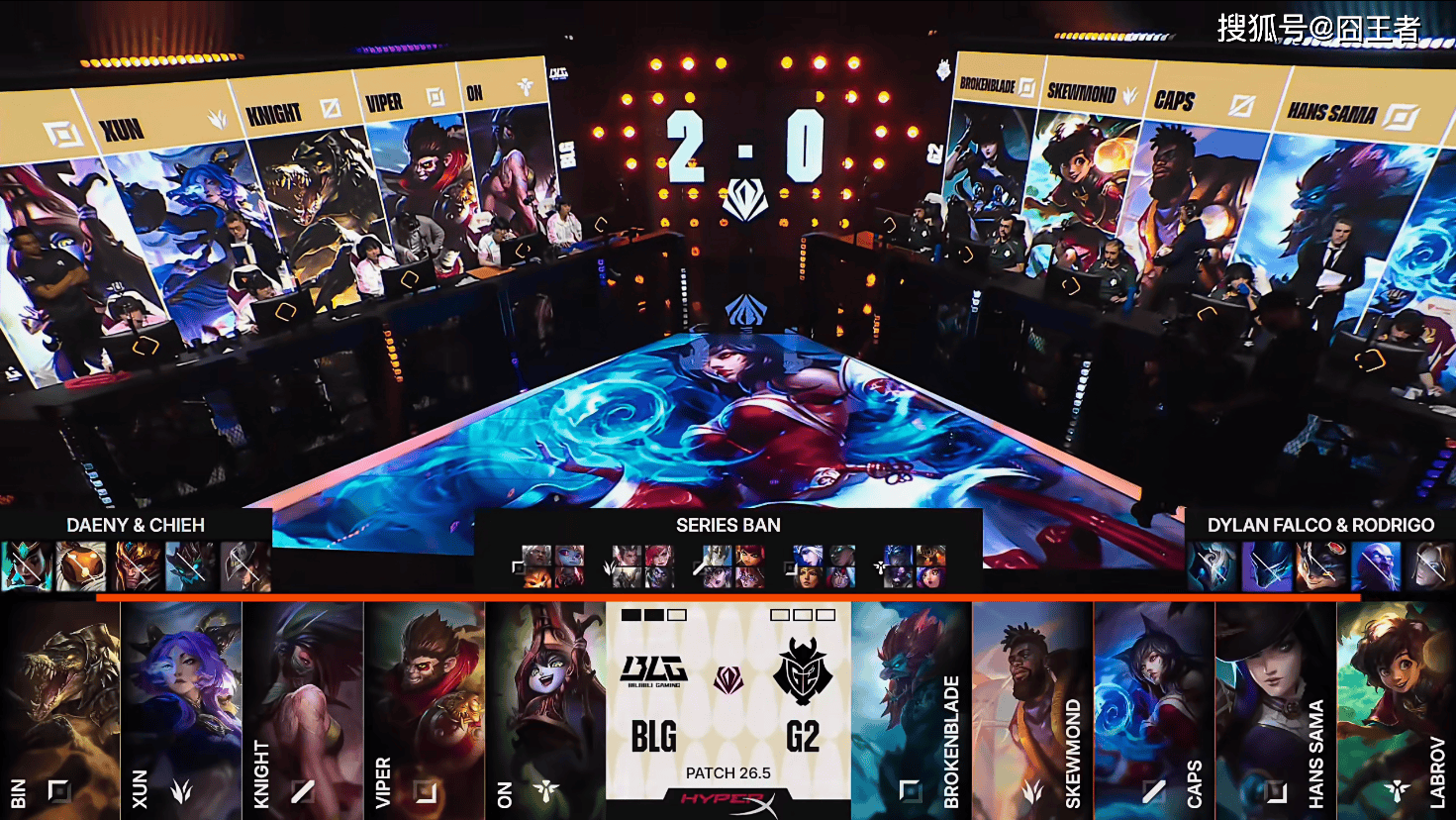 第二局比赛,BLG蓝色方,禁用:发条;兰博;瑞兹;塞拉斯;亚索,选用:Bin纳尔;Xun潘森;Knight辛德拉;Viper希维尔;ON牛头;G2红色方,禁用:卡尔玛;巴德;皇子;阿狸;妖姬,选用:BrokenBlade塞恩;SkewMond蒙多;Caps阿萝拉;Hans Sama韦鲁斯;Labrov妮蔻