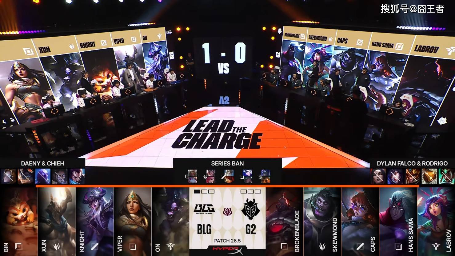 第一局比赛,BLG蓝色方,禁用:发条;兰博;瑞兹;鳄鱼;贾克斯,BLG选用:Bin狼母;Xun赵信;Knight加里奥;Viper寒冰;ON慎;G2红色方,禁用:韦鲁斯;卡尔玛;皇子;萨勒芬妮;牛头,选用:BrokenBlade波比;SkewMond蔚;Caps安妮;Hans Sama塞纳;Labrov泰坦