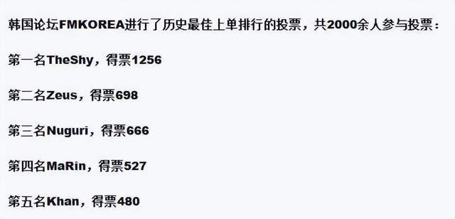 这份榜单中还有一个让人感到意外的地方是Zues仅排第二,这让很多LPL观众比较难以理解。毕竟作为新科S赛冠军并且在S赛决赛贡献了完美的上单表演,当红炸子鸡的人气、热度本该在这种投票活动中占据优势,可结果韩网观众虽然仍旧将Zeus投到了历史上单TOP5的第二位,但第一名却出乎意料的属于LPL赛区的传奇上单选手The Shy。