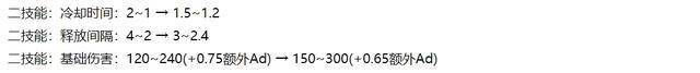 其次,二技能会提升20%基础数值,虽然额外Ad加成也从0.75降低至0.65,但只要额外Ad别超过600点就是全面提升。