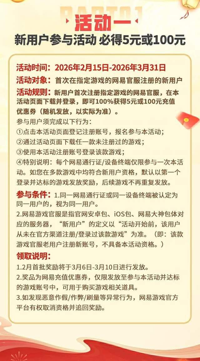 但咱玩家过日子,能省则省,能少花点岂不是更香?重点来了!官服玩家专属福利,直接帮你省出部分时装钱——网易新春开运福利补贴活动正在火热进行中,新用户注册官服100%中奖,直接领5r或100r充值券,无门槛就能用!运气好抽到100r券,直接白嫖整套时装,相当于官方免费送春天新衣,血赚不亏~