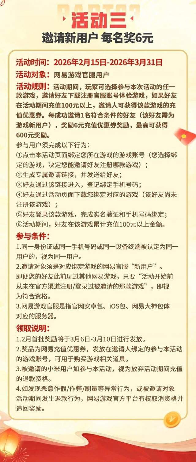 老玩家也别羡慕,邀新福利直接让你实现“零成本”穿新衣!操作超简单,不用费脑,三步就能搞定:第一步,打开活动页面,绑定自己的逆水寒官服账号,生成专属邀请链接;第二步,把链接发给身边没注册过逆水寒官服的朋友(哪怕朋友玩过其他网易游戏,只要没注册过逆水寒官服,就符合要求);第三步,让好友通过链接登记手机号、下载逆水寒官服,完成实名和手机号绑定,并且在活动期间累计充值100r以上,你就能领到6r充值券。多邀多赚,最高能领600r充值券!