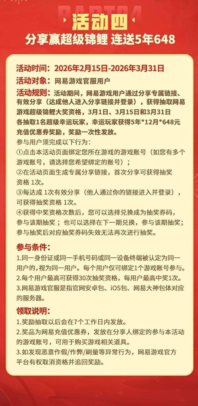 还有两个隐藏福利别错过!一是小米设备用户专属福利,用小米、Redmi、POCO手机或平板,首次注册逆水寒官服并充值6r及以上,就能100%返还6r充值券,相当于首充免费;二是分享活动抽超级锦鲤,绑定官服账号、生成分享链接,首次分享得1次抽奖资格,好友通过链接登录再得1次,能参与3月15日、31日的抽奖,幸运儿能领5年每月648r充值券,别说一套时装,后续所有外观都能轻松拿下!