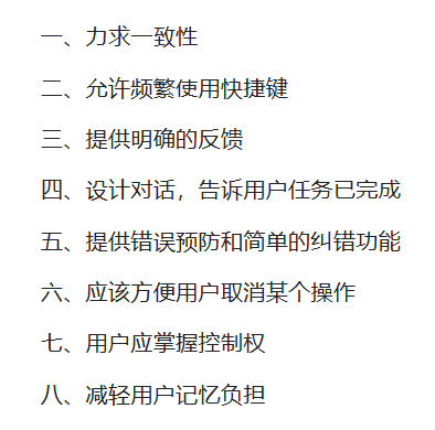 而操作冗余只是交互问题的冰山一角。在交互设计领域,有一本被广泛引用的经典著作叫《用户界面设计——有效的人机交互策略》,其作者总结了八项黄金法则。我把截图放在这里,大家可以简单看一下: