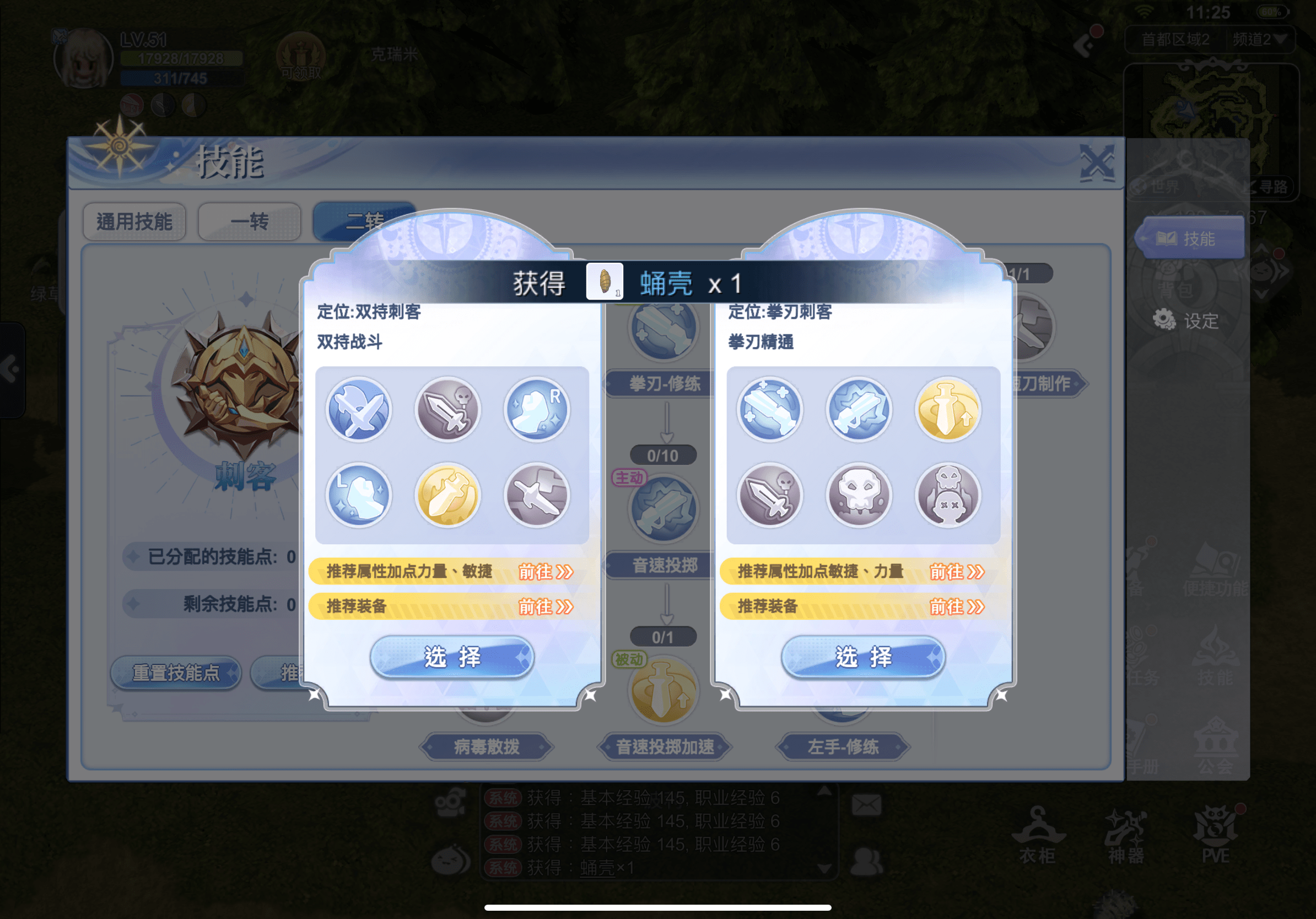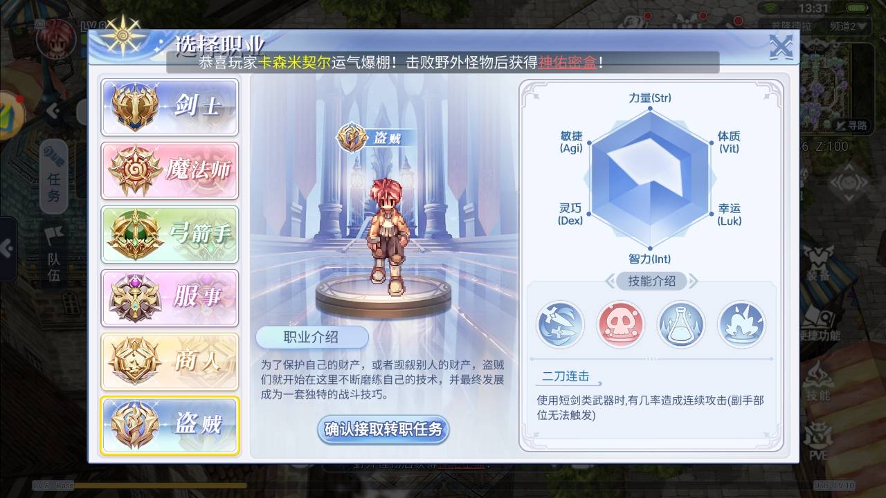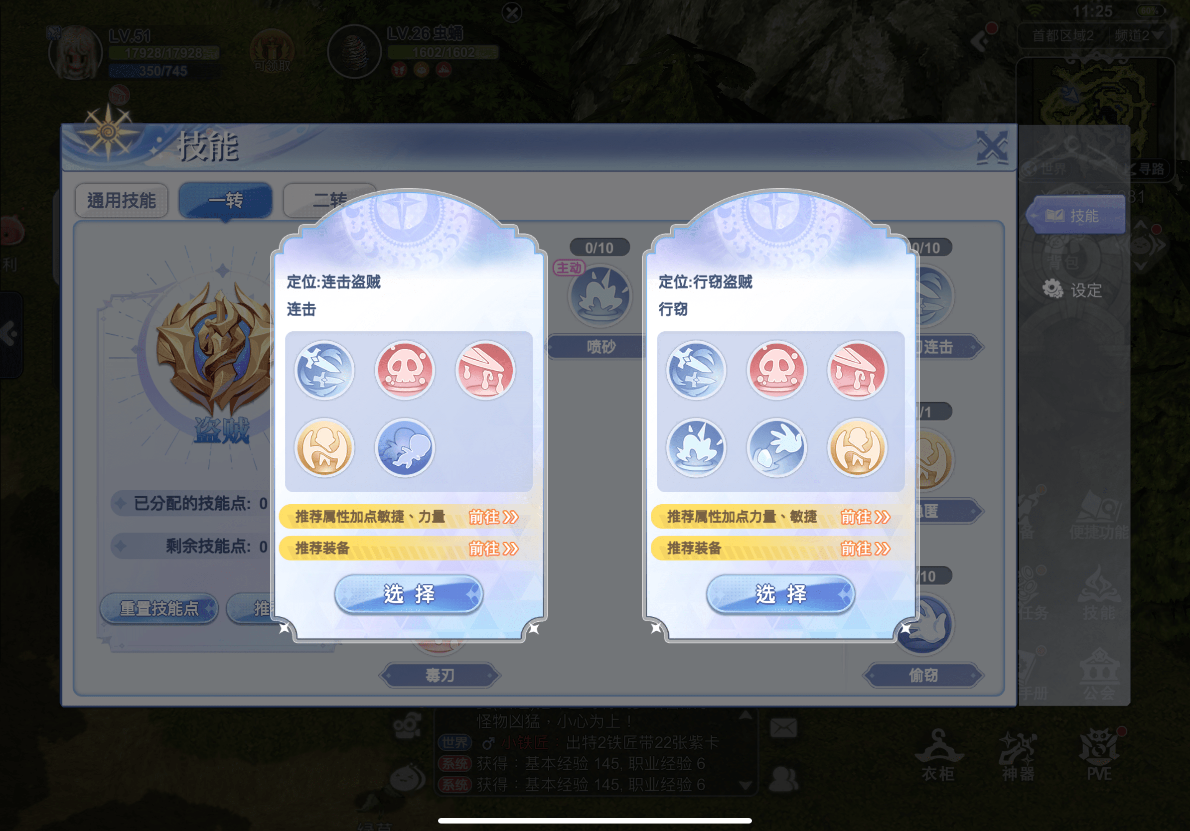 对与盗贼这个职业来说技能就没那么重要了,可以选择隐匿(隐身),偷袭和逃跑都用的上,一般来说盗贼到了二转一直平A就可以了,一转可以把他的被动技能二刀连击给加满,一转也是有两个职业定位可以选择的,第一个是连击盗贼可以触发连击效果,第二个就是行窃盗贼,建议选择第一个连击盗贼,二转过后变成了刺客,有双持刺客和拳刃刺客,双持刺客顾名思义就是可以装备两把武器,拳刃是使用一把武器,拳刃武器是双手武器。盗贼职业用的是平A,技能很少用。
