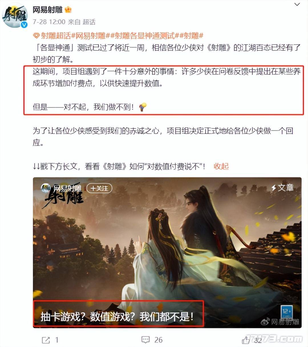 游戏的官方微博此前就曾经发布了文章,明确表示了游戏不会贩卖数值。自己不会成为一款靠卖数值来维持营收的游戏。同时官方也表示,从立项之初,就立志要做「世界一服」,做到真正的“全员共服,断绝滚服”,让《射雕》成为一款独一无二的武侠游戏。