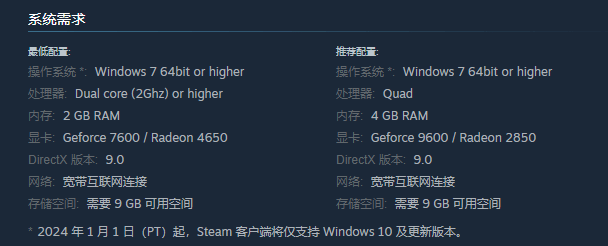 配置需求方面,这款游戏对硬件的要求极低,推荐显卡是 Geforce 9600 / Radeon 2850。