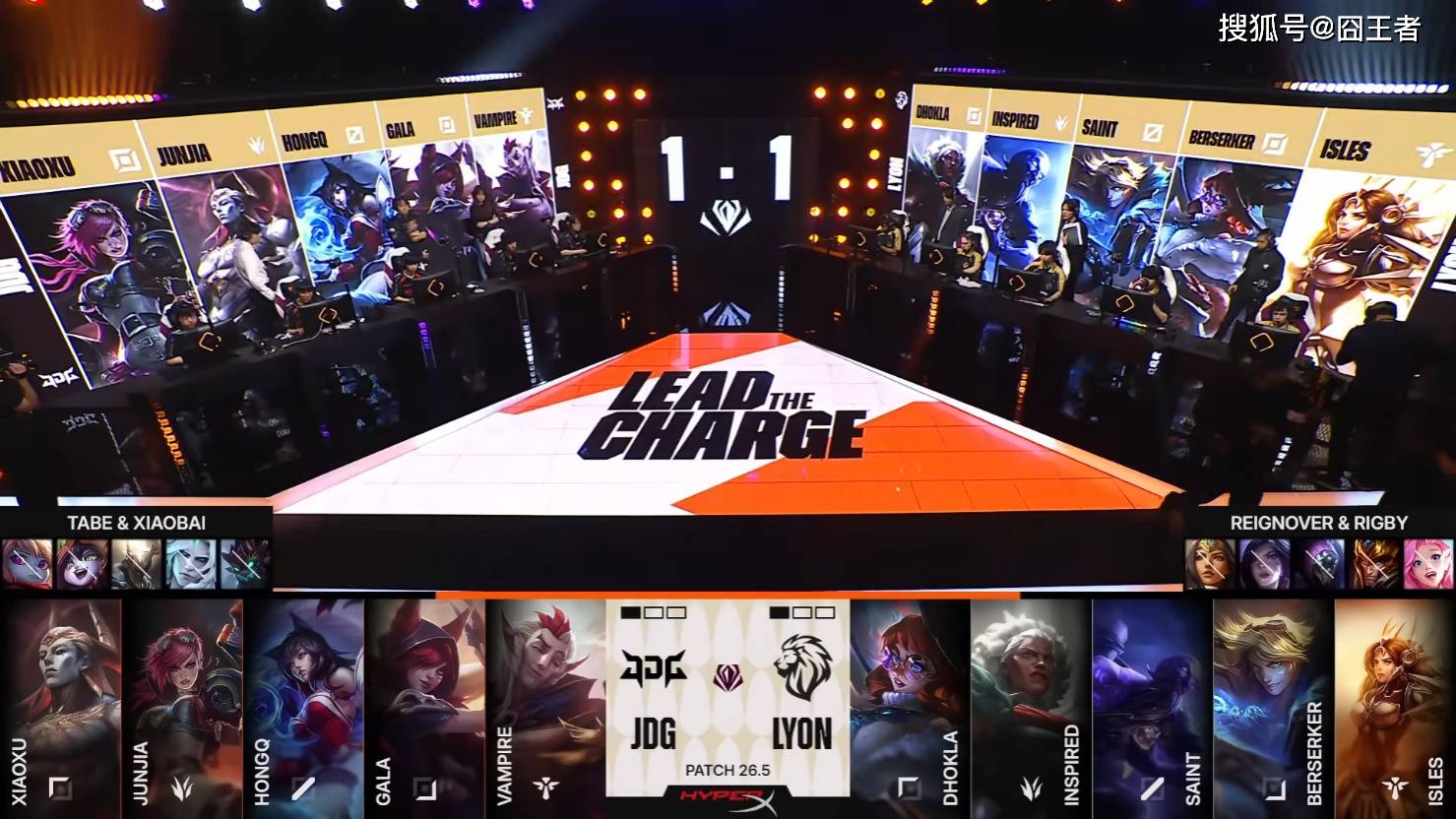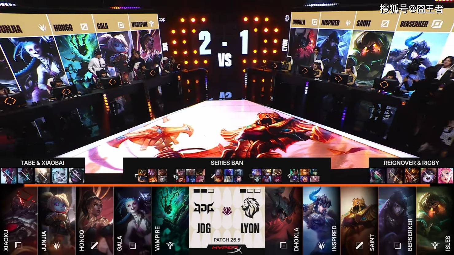 第一局比赛,JDG蓝色方,禁用:潘森、兰博、瑞兹、巴德、洛,选用:Xiaoxu鳄鱼;Junjia赵信;HongQ发条;GALA芸阿娜;Vampire扇子妈;LYON红色方,禁用:皇子、EZ、蔚、轮子妈、烬,选用:Dhokla纳尔;Inspired梦魇;Saint加里奥;Berserker韦鲁斯;lsles妮蔻