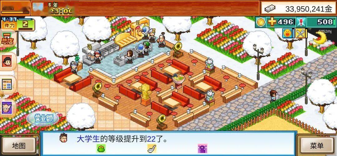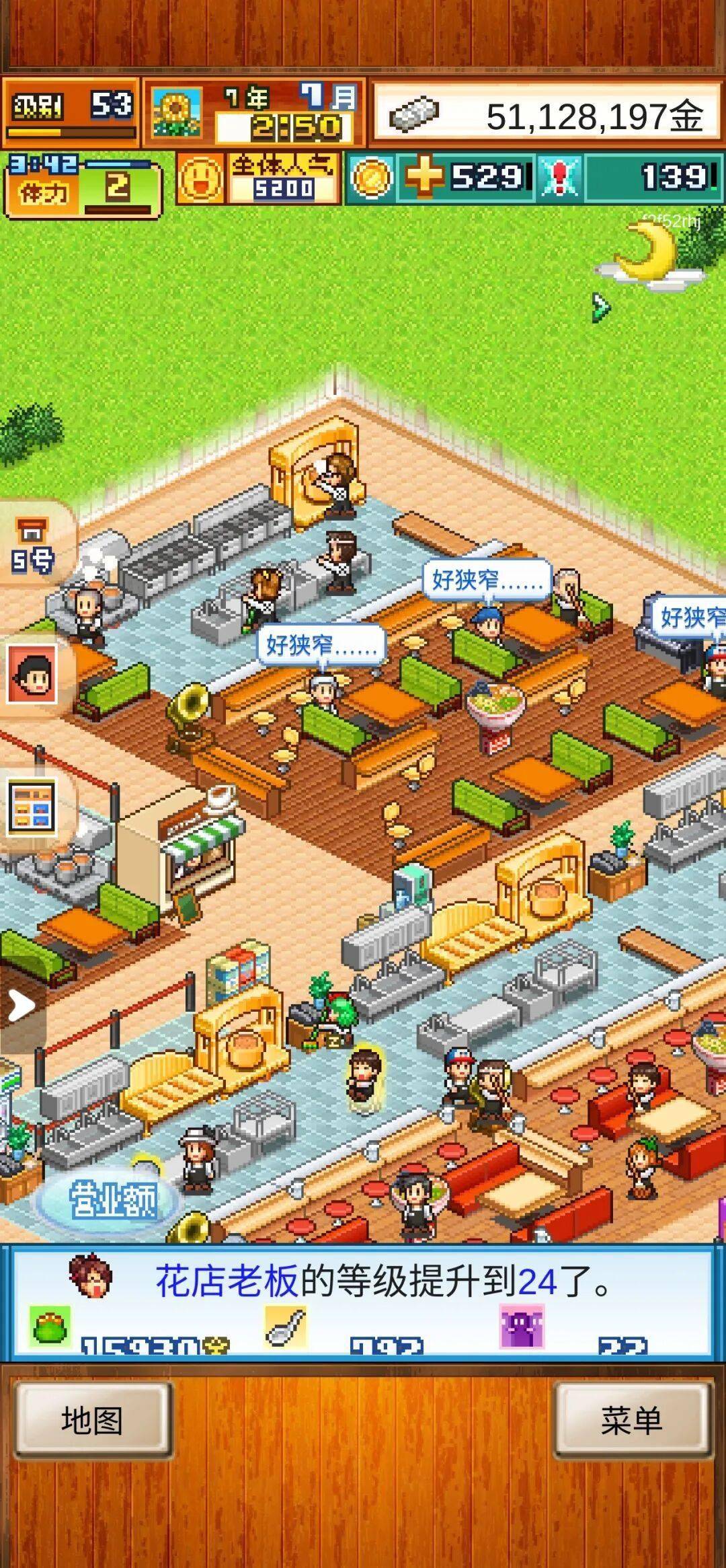 关于总店的店铺布局,前期遵循餐桌和环境设施交叉设置即可,只要两种相同的设施不挨在一起就不会影响店员和客人通过;当然,后期也可以遵循这个逻辑,但由于地图较大,还是放出布局比较直观。