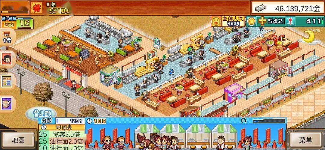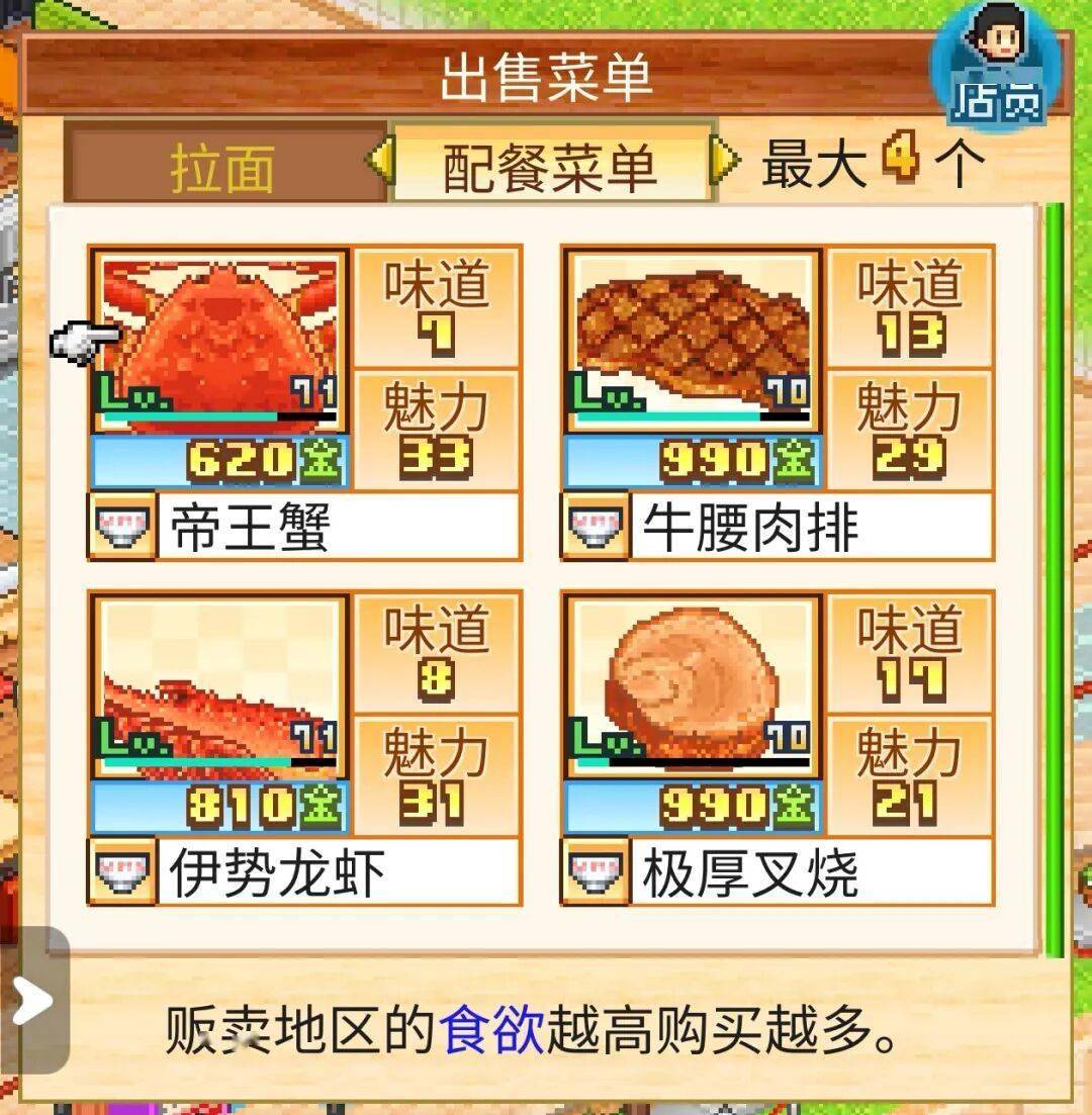 解决了布局问题后,关于店员设定、厨房布置、菜品设置则还存在一些小细节;首先是店员设定问题,我们完全没有必要卖配菜和饮料,把配餐菜单一栏放入各种食材让它们升级,然后放在拉面上可以大幅提升面属性。