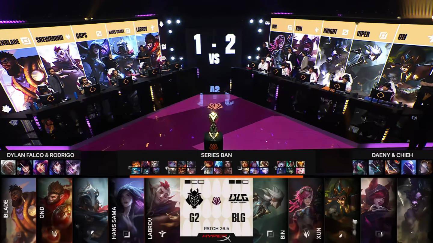 7 分钟,BLG 主动入侵野区,G2 人员先到,Hans Sama 卡莎拿到双杀,G2 完成零换三。