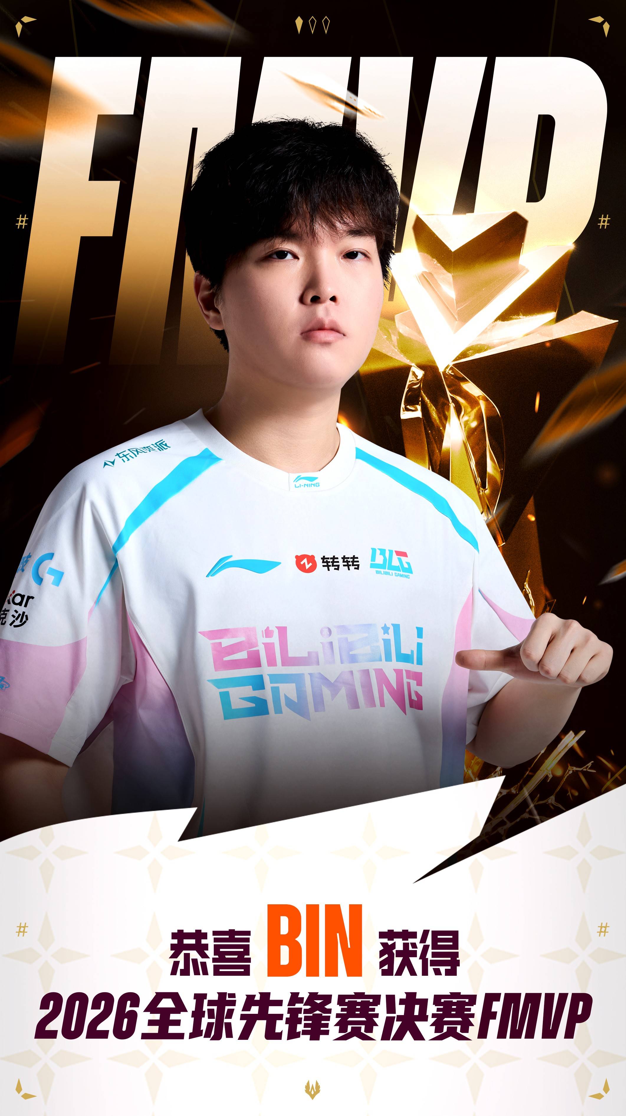 此外,BLG战队的上路陈泽彬(Bin)选手也凭借决赛中优异的表现,获得本次2026全球先锋赛FMVP的殊荣!