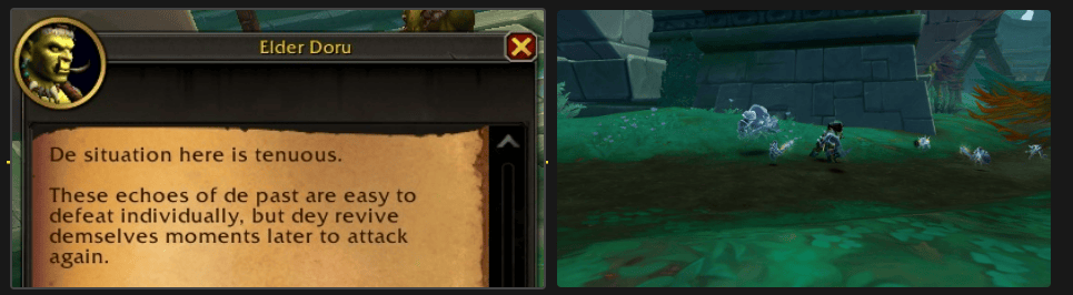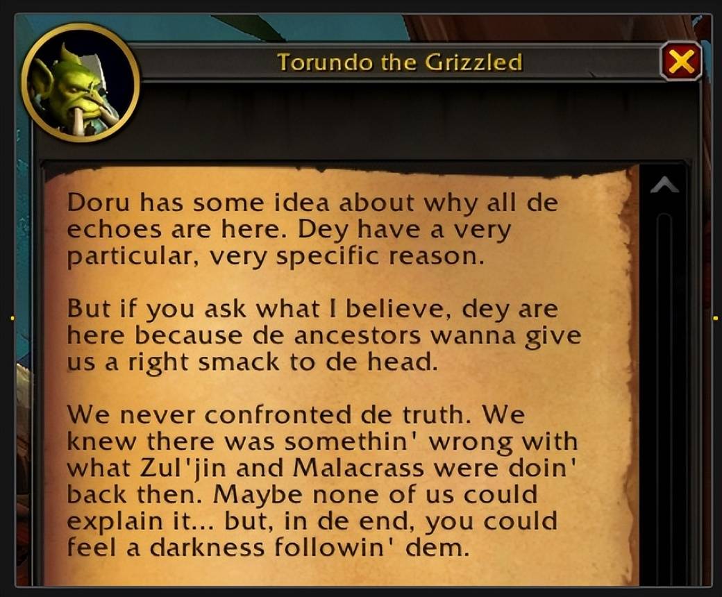 从对话了解,那些回响误以为自己正身处数十年前的那场激战之中,这也正是对TBC时代首次登场的祖阿曼团本的致敬和重现。长老多鲁痛斥祖尔金、莫尔杜恩、玛拉卡斯,他深感这漫天的血雨腥风最终并未给任何人带来丝毫益处,只会给活着的人增添更多需要收拾的烂摊子。如今,身处当下的生者们必须直面那段尘封已久的往事。