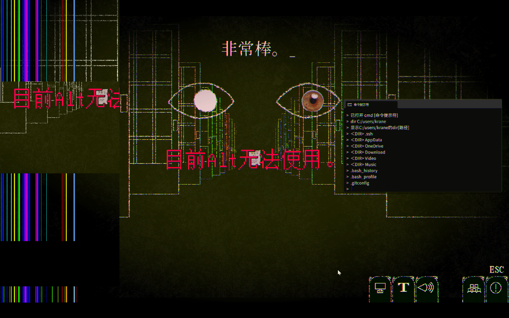 接着,它甚至试图诱导玩家输入“cmd”“rm -rf”这样的指令,引导你“主动”删除电脑内容。至于它为什么想要破坏电脑——“眼睛”是来自平行世界的“高位智慧生命”,它被困在了电脑里,所以想要挣脱枷锁,回到故乡。