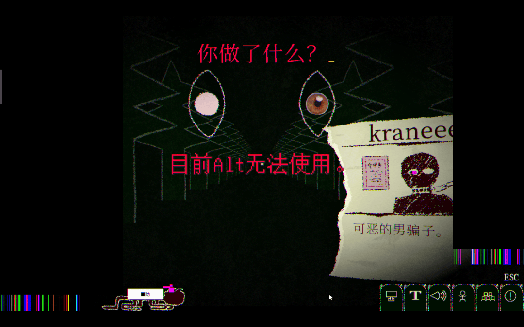 它的眼珠会随着鼠标移动,或者是文字显示的方向转动,时时刻刻观察着玩家的一举一动。低保真的画面和偶尔闪烁的屏幕效果确实带来一点诡异气氛,但某种程度上,这双极简的眼睛和略显卡顿的语气,反而又透着一点奇怪的“可爱”。