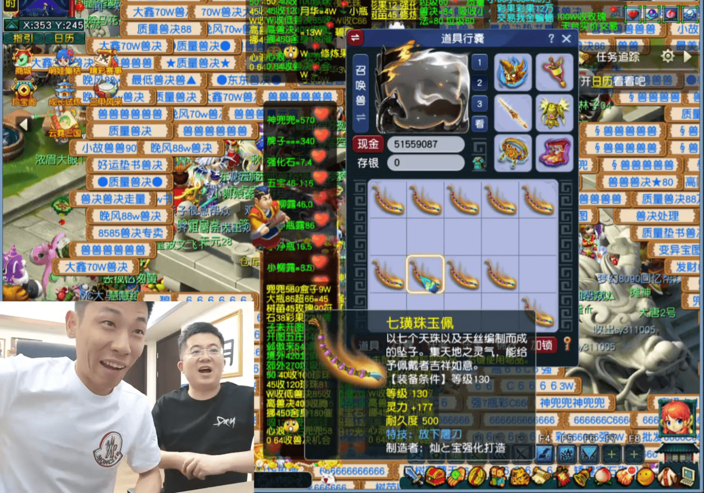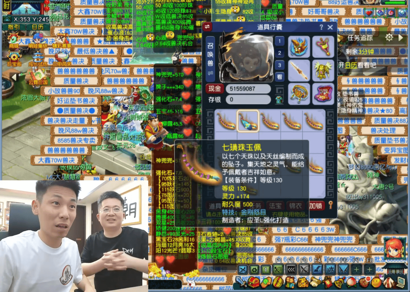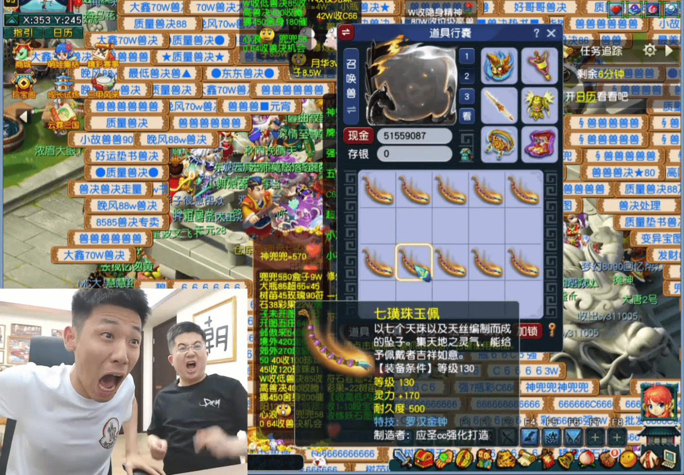 由于区内140级书铁存货不足,旭旭宝宝只好降低标准,开始鉴定130级装备。在鉴定项链部位时,大斌子随口一声“罗汉金钟”,结果言出法随,炸裂出货。只可惜其灵力仅有170,接近国标。