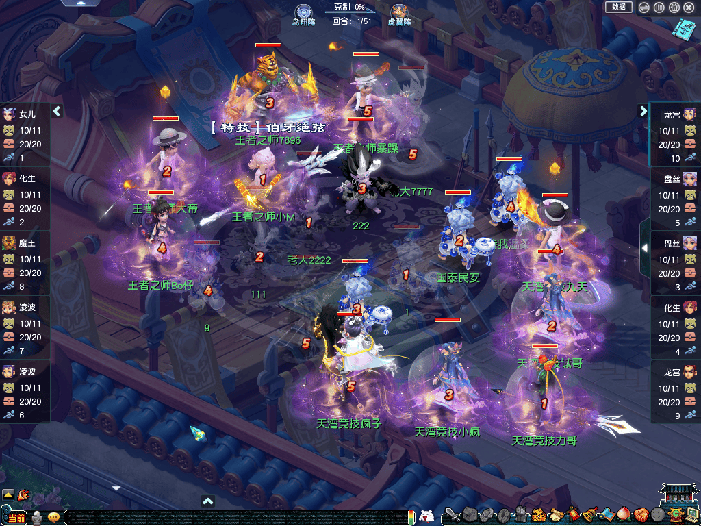 本场比赛双方火力全开,关键回合打得你来我往,核心输出轮番倒地,谁都不敢有丝毫松懈。不过,【天湾竞技】双龙宫的秒10输出更加炸裂,耗时51个回合成功击穿【王者之师】的防线。