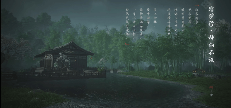 很有意思的是,游戏选择了美景配佳乐并赋诗词的章节叙述方式向玩家们呈现燕云世界的。比如在主章,第一张【神仙不渡】的动画中,这副竹林山居的场景真的仿佛“世外桃源”一般,给人极强的震撼力。看到这样的美景,也瞬间明白了古人为何如此钟爱溪边竹林这样的隐居之所了。