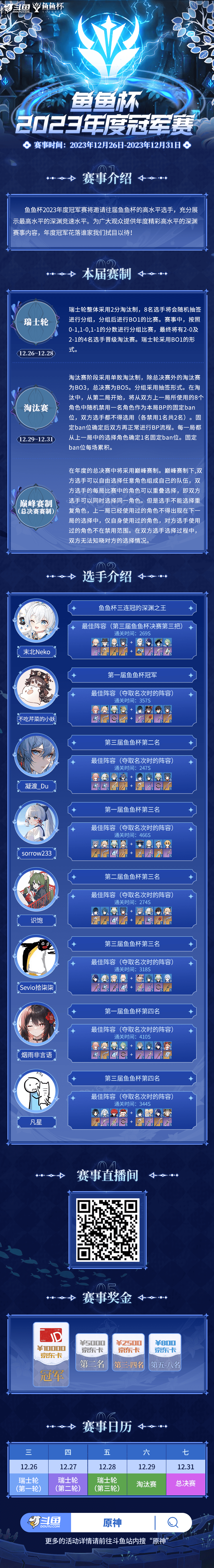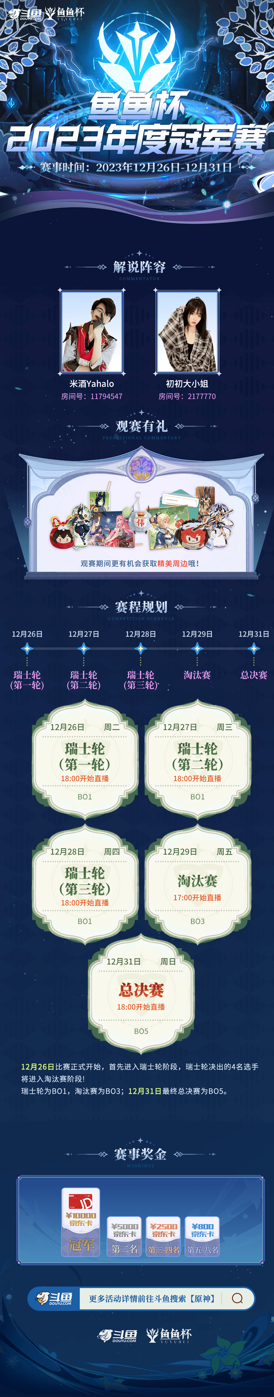 斗鱼原神第五届鱼鱼杯深渊BP赛将举办成年度冠军赛的形式,并于12月26日至12月31日举行。
