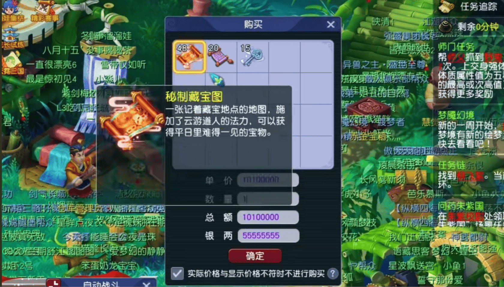 每次售卖50张秘制藏宝图,宝图的初始购买价格为1000万梦幻币,并会随购买量逐步递增。