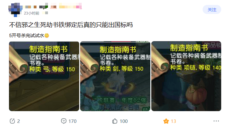 昨日,一位五开小伙在通关生死劫后,喜提几本高等级指南书。大家都说绑定的书容易出白板,但这位小伙偏不信邪,决定买铁打造,测试一下鉴定运气。