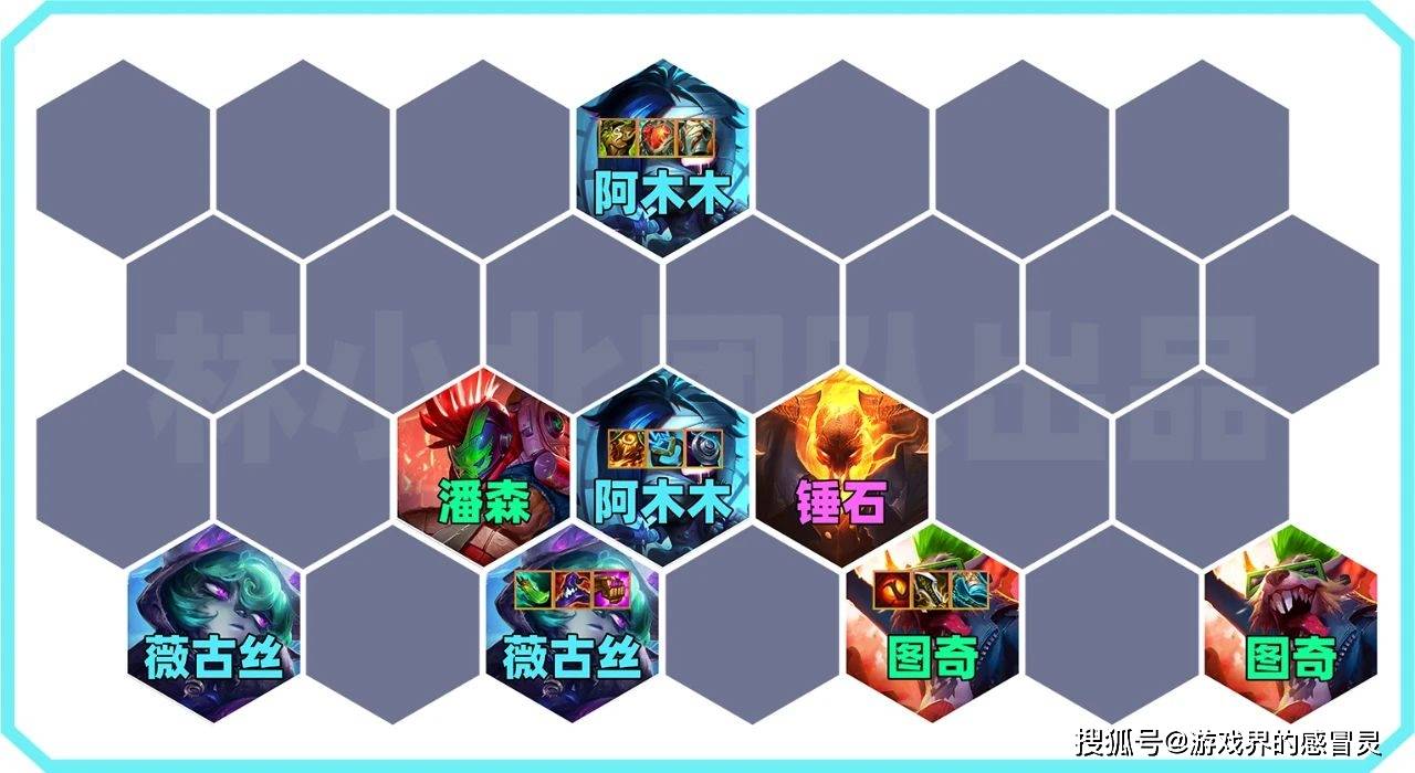 阿木木单顶聚怪,薇古丝和老鼠都站中间,保证阿木木聚完怪后,两者技能可以打到最多的敌人面对永恩、锐雯时,可以用三星阿木木去顶脸永恩锐雯,同时老鼠和薇古丝也要一起对位永恩、锐雯,直接集中伤害可以直接秒掉永恩、锐雯