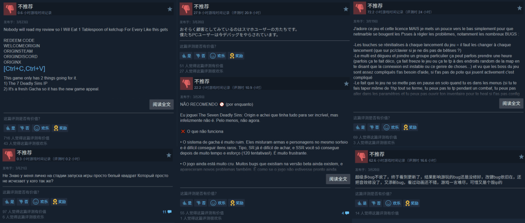 这不,Steam玩家骂惨了,感觉自己成了手游玩家的测试员,几乎每个评论多的语种下,都有相应玩家的高赞差评,如优化差、BUG多、抄《原神》等问题,不胜枚举。