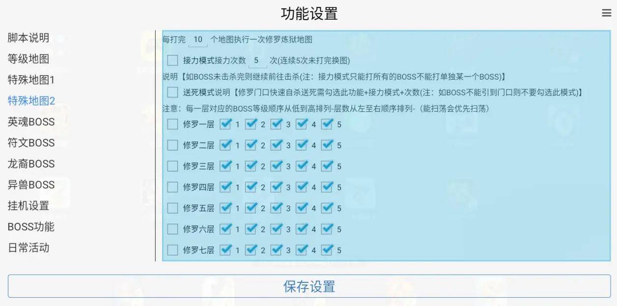 然后是如何设置脚本,很多朋友开脚本都是为了去刷修罗地图的,今天就给大家重点讲一下修罗应该怎样设置,修罗的进图模式是每打完10个地图(默认设置是10个)然后执行一次修罗地图,如果我们要一直刷修罗地图,可以把10改成1,这个是可以自由设置的,然后我们把要打的修罗地图的层数和等级打上勾即可。