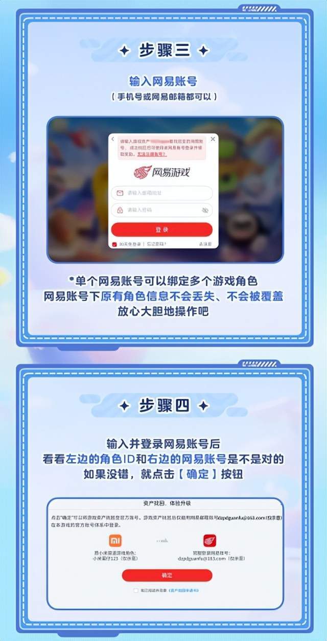 接着绑定官服网易账号,输入你要用来登录官服的网易账号(手机号或网易邮箱都可以,没注册的直接注册),确认小米渠道服的角色ID、服务器没错,避免转错账号。确认信息无误后,点击“确认转移”,在提交审核并角色资产会同步到官服,只要耐心等待就好。