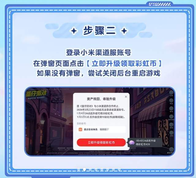 然后登录并触发资产转移弹窗。打开小米渠道服,登录自己的账号,页面会自动弹出“资产找回、体验升级”的弹窗(如果没弹出,重启一下客户端就好),点击弹窗进入转移页面。