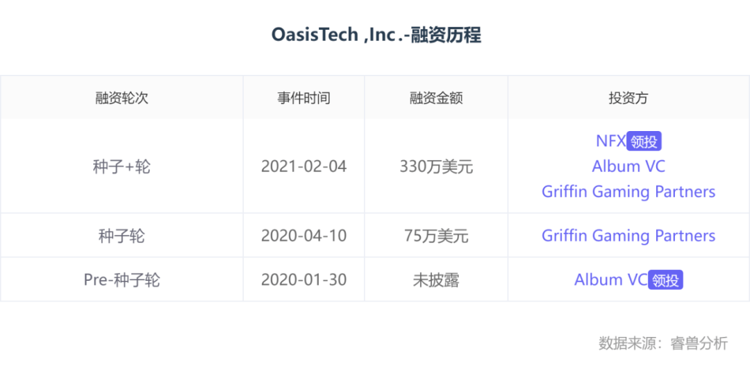 据睿兽分析,Latitude共获得3抡投资,投资方包括NFX、Album VC、Griffin Gaming Partners。据CB insights,Latitude最新获得融资在2023年4月,由Coho Deeptech领投其种子轮第三轮,截至目前,共筹集410万美元。