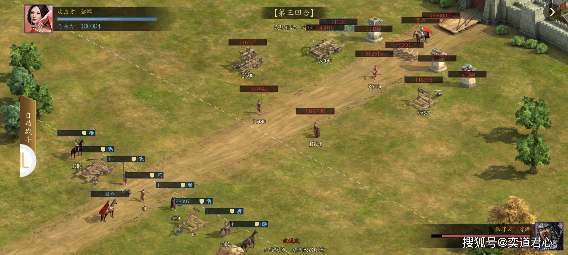 好奇想看看曹操的老婆究竟能够撑多久,我特意调整了关羽,让他完全注重防御。卞夫人倒也不客气,她率先在第一回合打出了进攻,自然是被关羽给防住了。关羽的反击我是真控制不了,才4个回合,卞夫人就已经被刮掉了将近一半的血量。