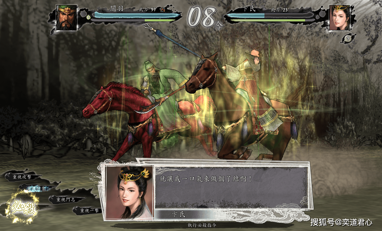 卞夫人在三国志11游戏里的武力值只有23点,而关羽的武力值高达97点,两人的账面武力差距足足71点,而这又刚好是曹操在游戏里的默认武力值,只能说是太有缘分了。本以为关羽会直接秒杀了她,我也就没想着继续往下延伸,却不料卞夫人撑过了CG动画,这就有点儿意思了。