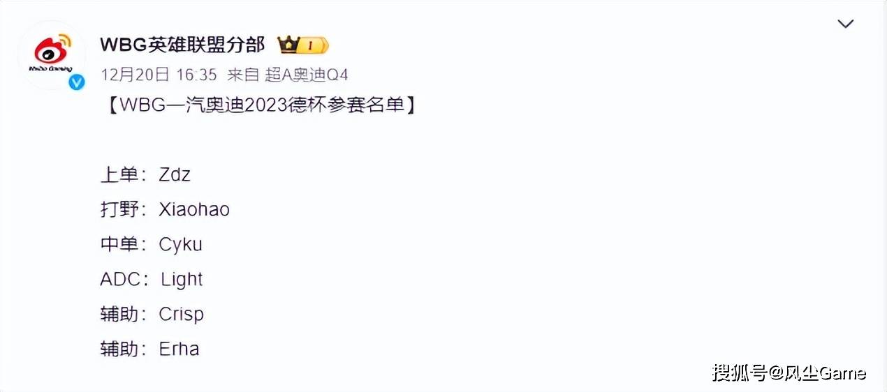 BLG、LNG两支战队,都是全员主力出征,JDG因为Kanavi在韩国,派出了Ruler、Yagao带新人,WBG在12月20号,也公布了名单,中单小虎和主教练丹神不参加,其余位置都是主力选手,小虎在此前NEST出征了,看来加班之后,不想再被剥削了,直接选择休息看戏。