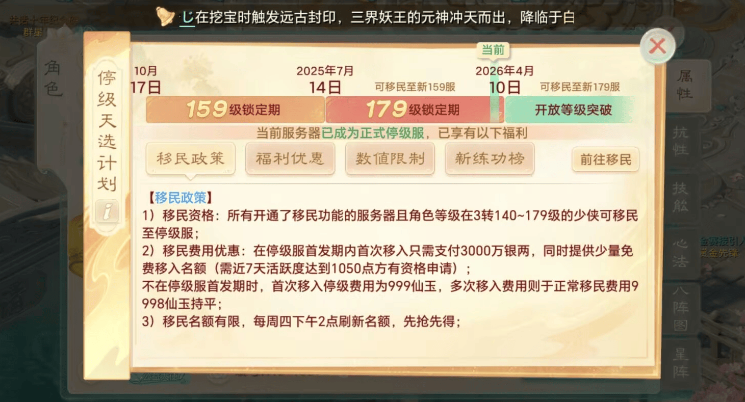 移民费用也有优惠,首次移入停级服,需要支付3000万银两,七天活跃达到1050点的有资格申请免费移入名额。不在停级服首发的,首次移入需999仙玉。
