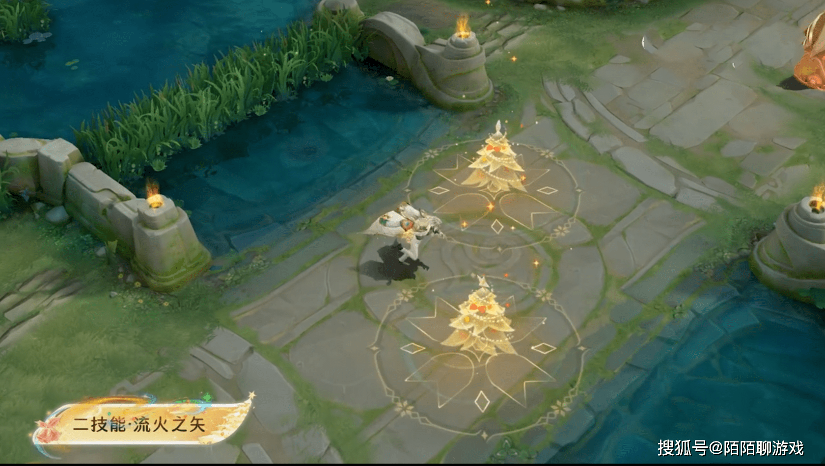 二技能:从天而降一颗星星点亮形成一棵圣诞树,周围有粒子环绕。被大招点亮时,会有环绕的魔法粒子从下往上触发;