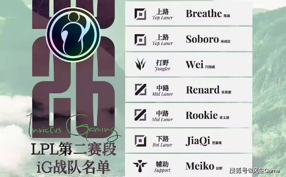 新的下路双人组,是滔搏的Jiaqi和Meiko,软辅版本,妹控应该挺强的,就看两人磨合得咋样了,中单位置,和网传的一样,除了Rookie之外,小中单Renard也在名单里,而且他99%概率是打首发的,因为IG的官宣阵容图里面,有一行特别小的字:第二赛段Meiko,将暂代队长一职。