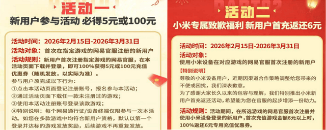 而且被邀请的萌新也不亏,作为网易游戏官服的新用户,只要在活动页面完成报名、下载游戏并登录,就能百分百领到5r或100r的充值优惠券,随机发放,就看哪个萌新欧气更足了。小米设备的萌新也有专属福利,首次注册并登录网易官服,完成实名和手机号绑定后,首次充值6米以上就能100%返还6r专用充值券,这届萌新实在吃的太好了吧!