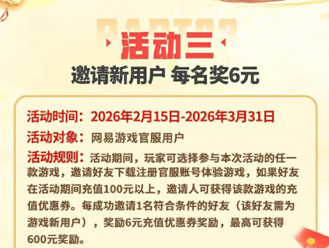 网易游戏2026新春开运补贴福利活动还在进行中,一直到 3月31日都能参与,除了《蛋仔派对》,还有《逆水寒手游》《第五人格》《永劫无间手游》等一众网易游戏都可以参与的噢~