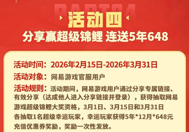 更夸张的是,这次还有超级锦鲤大奖等你来抽,冈易豪气冲天,直接承包5年×12个月×648的充值优惠券,一次性发放!只要在活动页面绑定游戏账号,生成专属分享链接,每让一位好友通过链接进入并登录,就能获得一次抽奖资格。3月31日就开奖,万一成为那个幸运儿,以后蛋仔派对的dongdong羊、大翅膀这些外观都能闭眼入,再也不用为蛋币发愁!