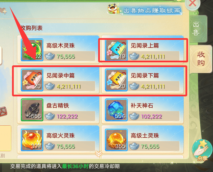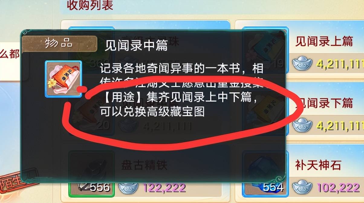 在大话西游手游交易服,你会看到很多商人在高价收见闻录,420万银两收见闻录,440万银两出见闻录,大概13~14RMB收见闻是很正常的价格。见闻录(上/中/下篇)是合成高级藏宝图的唯一材料,而高级藏宝图可直接挖出仙器、神兵、高阶技能书等高价值物品。