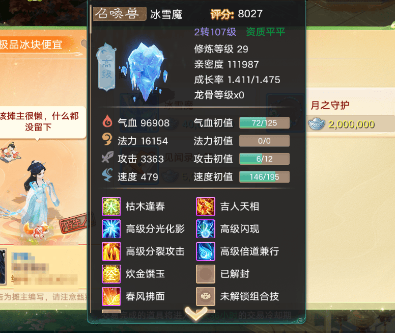 冰雪魔是非神兽中唯一兼具高气血与高速度成长的高级召唤兽,被称为“平民神宠”,敏血双修,成长率高达1.275,初值气血36–125、速度58–195,可灵活培养为血宠或敏宠,标价4000万银两起步没毛病。
