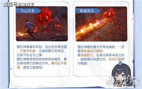 激光:猩红神兽使用突进和抓投技能时,要注意观察它的移动方向,横向拉开距离,避免正面接招。