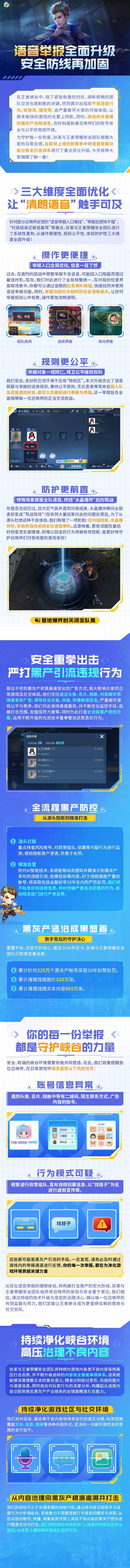 IT之家注意到,腾讯《王者荣耀》官方今日还宣布新赛季将对「语音举报」和「黑灰产安全打击」相关内容进行全面升级。