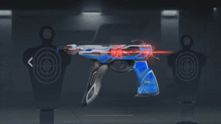 这里我们就来看一下这个检视动画效果:点击后,枪身中间的科技眼装置会瞬间分散悬浮,在正前方投射出一个全息的时空空洞,而后一枚枚来自未来的子弹从中飞射而出,视觉效果极其震撼,深深击中了我的心。