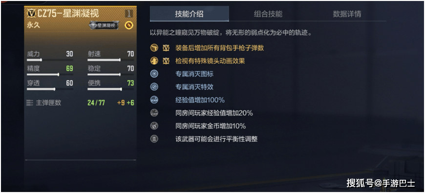 CZ75-星渊凝视的属性除了“装备后增加所有背包手枪子弹数”外,还增加了一项“检视有特殊镜头动画效果”;