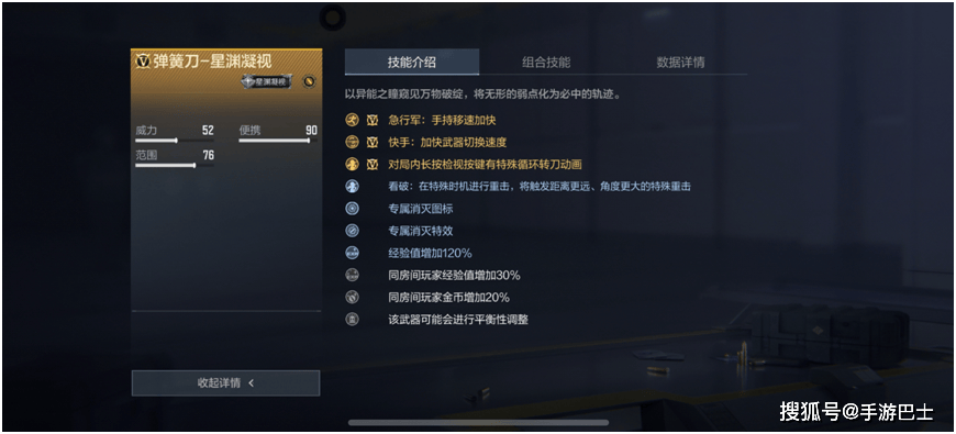 弹簧刀-星渊凝视的属性设置了“急行军:手持移速加快、快手:加快武器切换速度、对局内长按检视按键有特殊循环转刀动画及看破:在特殊时机进行重击,将触发距离更远、角度更大的特殊重击”的属性,同样具有新意。
