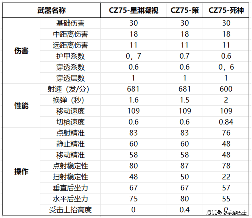 CZ75-星渊凝视和CZ75-死神相比,CZ75-星渊凝视在射速、精度、稳定、便携都有较大优势;而和CZ75-策相比,换弹、稳定性有些不足,这里也整理了相关武器对比数据,供大家参考。